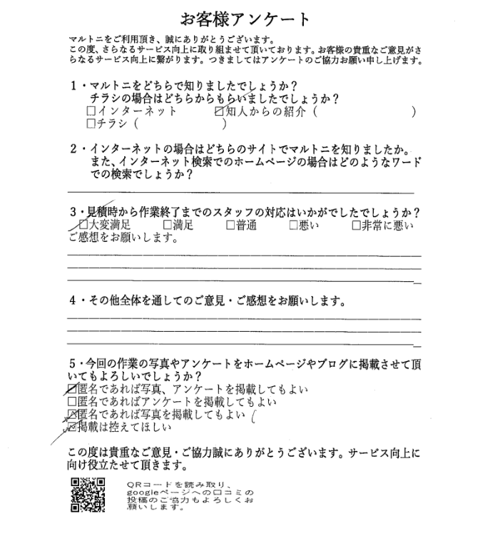 愛知県名古屋市千種区 H様 特殊清掃 2025/09/05 お客様よりアンケートを頂きました。 名古屋市千種区にて特殊清掃の手伝い作業をしました。 マルトニでは特殊清掃、遺品整理、お部屋の片づけから解体工事まで行っております。 愛知、岐阜、三重が対象可能エリアとなっております。 お困りごとがございましたら、どのようなことでもお気軽にお声がけください。 愛知 お客様アンケート
