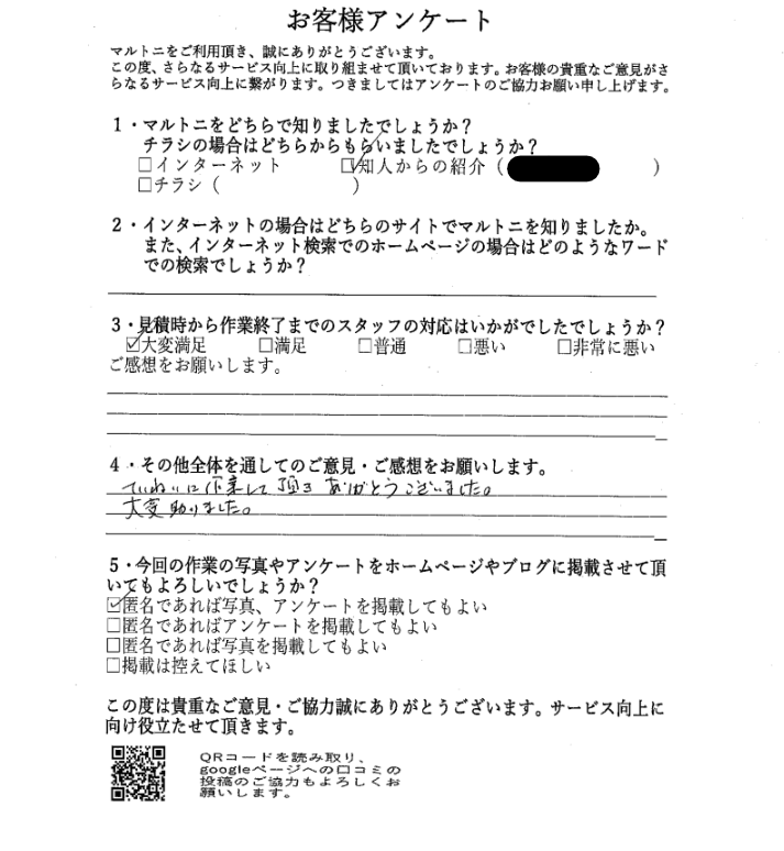 愛知県名古屋市南区 S様 残置物撤去 2026/01/15 お客様よりアンケートを頂きました。 愛知県名古屋市南区にて残置物撤去の手伝い作業をしました。 マルトニでは特殊清掃、遺品整理、お部屋の片づけから解体工事まで行っております。 愛知、岐阜、三重が対象可能エリアとなっております。 お困りごとがございましたら、どのようなことでもお気軽にお声がけください。 愛知 お客様アンケート